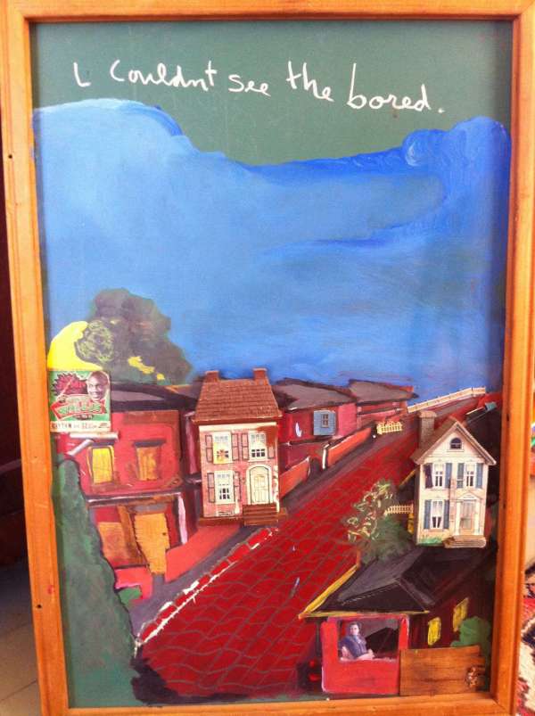 “I couldn’t see the bored” was my favorite of his, so you can imagine how pleased I was when he gave it to me as a thank you for believing in him… and for being his friend…and for all I had done for him. That’s Eartha Kitt in the right corner sitting in for gauvin’s mom. You can imagine my disappointment when he told me he wanted it back. I was afraid he’d try to sell it to get drugs. He finally told me he wanted to give to his mom. We made an arrangement for mutual friends to ship it to his mom. But that didn’t happen before he died. It hangs in my house where I see it often. It’s only been gone for a few days for this show but it feels like something critical is missing.