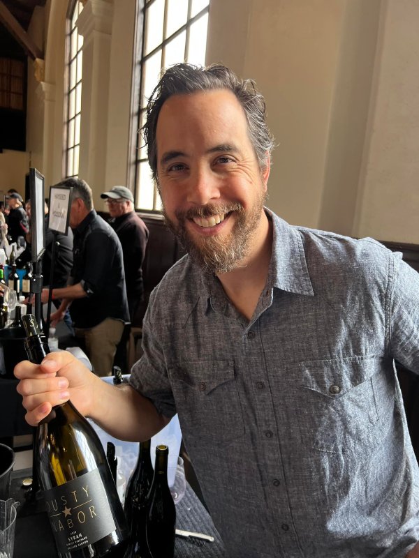 Dusty Nabor pours his wines at the Garagiste Festival in 2023 in Solvang Veteran’s Memorial Hall; he’s actually lives in a neighboring town!