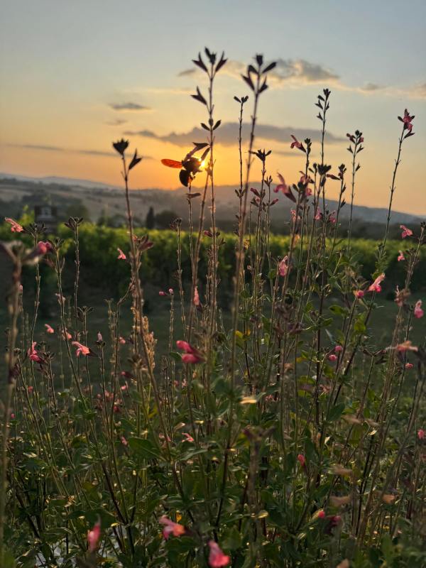 I’m grateful also for the amazing wine travel experiences I had during a series of press trips in Italy and Austria to meet winemakers and taste their wines in Tuscany, Umbria, Puglia, Emilia-Romagna, and Vienna during seven weeks from mid-May until early July. My vineyard visits included this one in Montefalco, Umbria where I found a bee seeking sustenance from a flower in the final moments of the day in Umbria, Italy at Cantina Antonelli during our final evening with members of Consorzio Tutela Vini Montefalco. I was delighted to learn on this trip that so many wineries like this one in the region are already organic or in conversion to organic production for wine, olive oil, and other artisan products. This was a very rewarding and eye opening few days here in Montefalco with gorgeous views and beautiful wines, people, and cuisine!