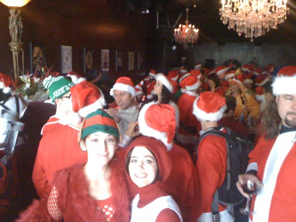 It was a rainy Santacon today in LA but judging from tweets from SF Santa and LA Santa a good time just the same (see tweetpics like this one or http://twitpic.com/ta1qj of elves in Pershing Square LA for evidence!)