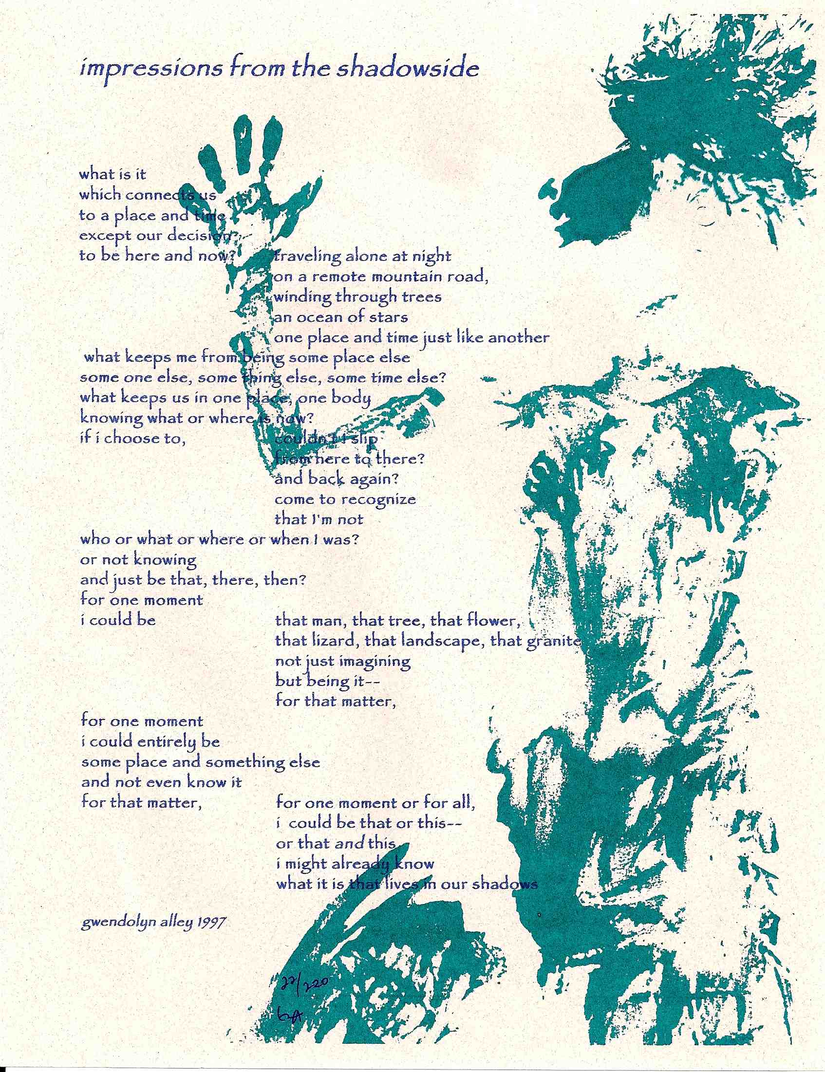 (Note: I wrote this poem several years ago when I was invited to be the “featured artist” for a science fiction writers conference on the Queen Mary. This poem was published in the conference program, I had a poetry reading and reception as part of the conference, and I had a room to hang my artwork, mostly body paintings and broadsides. “Impressions from the Shadowside” was also the title of a solo show I had that summer; Yves Klein did “blue”– I did green and other colors. This broadside was published in ArtLife Limited Editions 8/97.